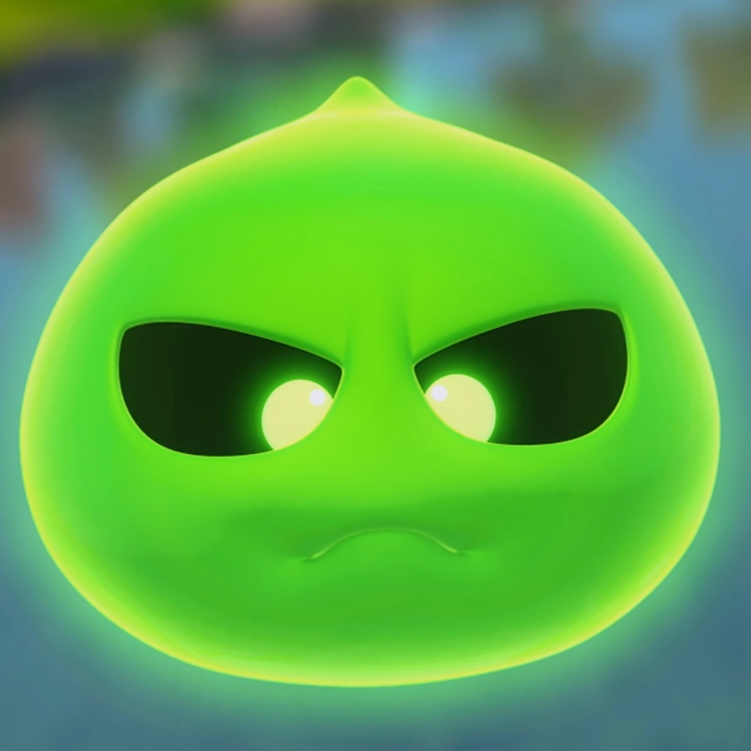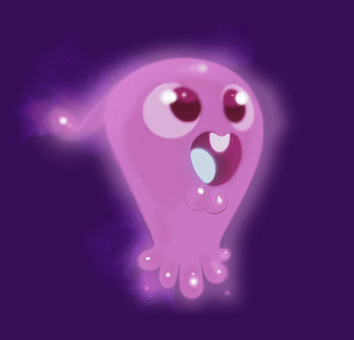 Glups is a ghost that is shaped like a teardrop with black scleras and a small mouth. He is normally pink, but he would become green if he ever gets exposed to a large amount of sunlight when he's outside in the daytime.