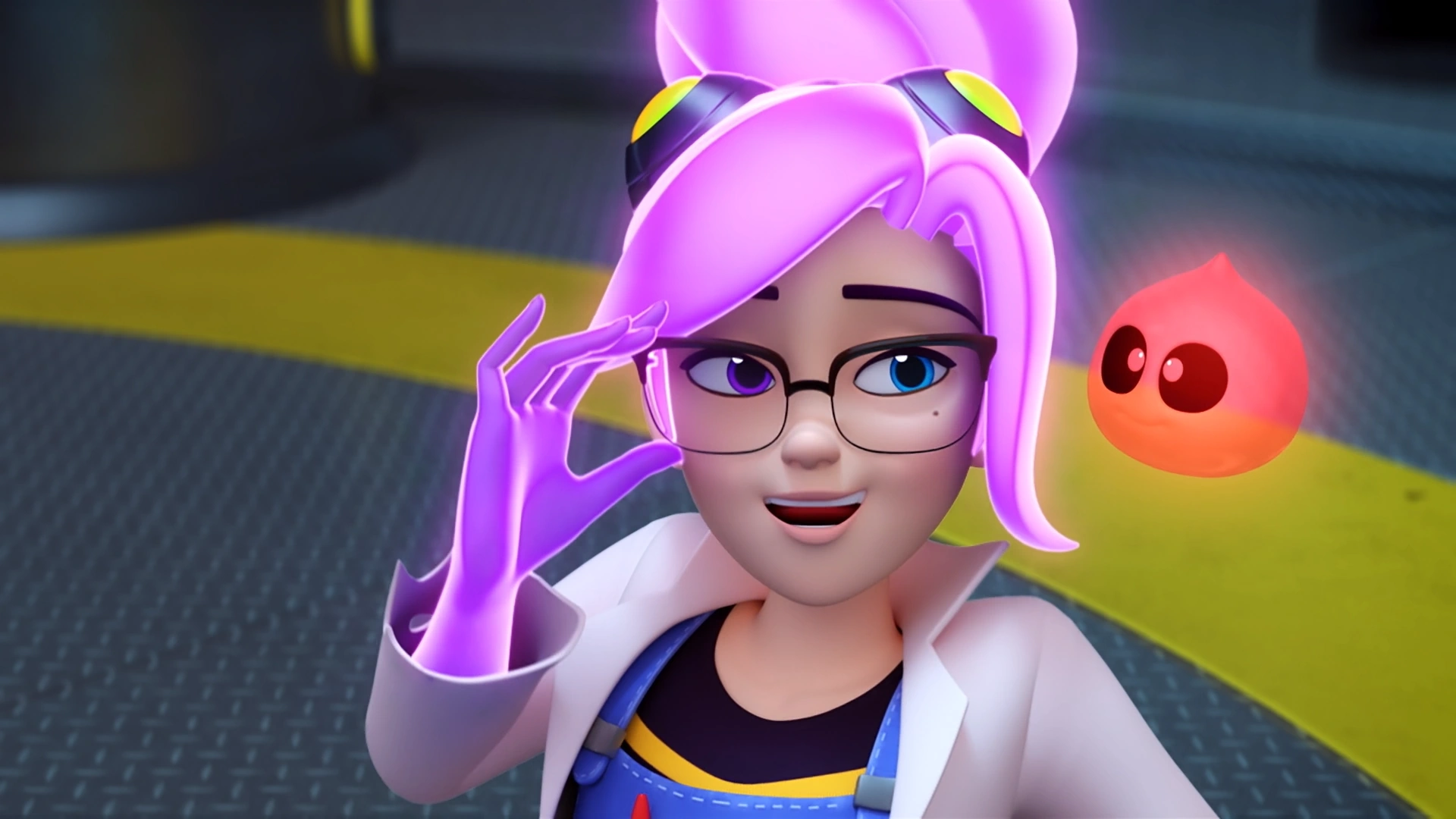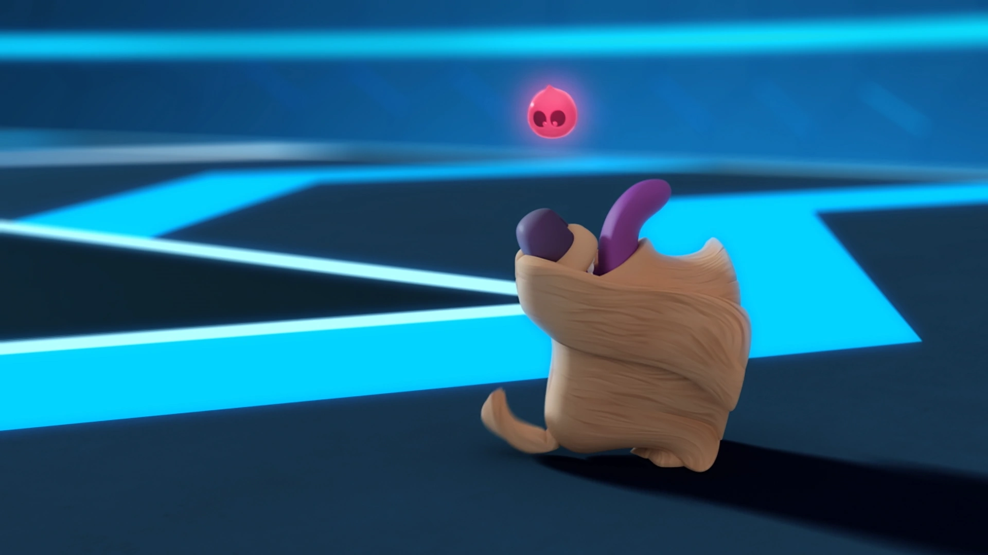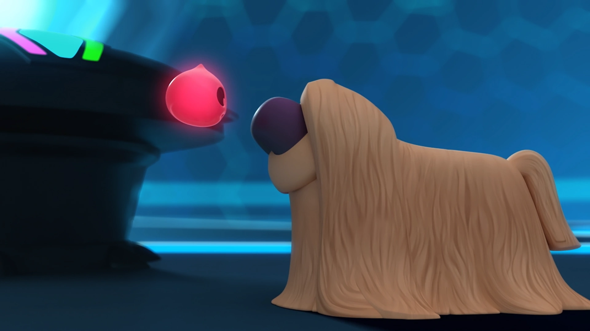 In "Scream Scratch", Glups was watching Miss Jones working on a new version of the Ghost Gauntlet in the lab's garage when Andy arrived with Asta. He curiously examined Asta before he started playing with him by letting the dog chase him around the garage. When the main trio all left, Glups continued to play with Asta but he didn't let Miss Jones know about the dog in the garage since she was focused on the Ghost Gauntlet.