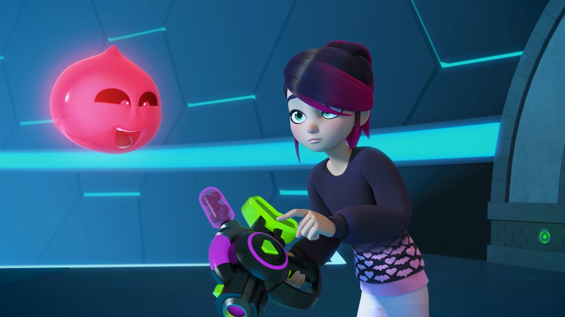 In "Jellyjack", Glups got hungry in the afternoon and let Miss Jones know about it while she was in the middle of upgrading Glowboo. He was then fed Scaryballs by her when Liv arrived soon after and witnessed him growing a little larger after digesting his meal. Miss Jones offered Liv to feed Glups but also warned her that he must be fed one more Scaryball to avoid the risks of going into booster mode.