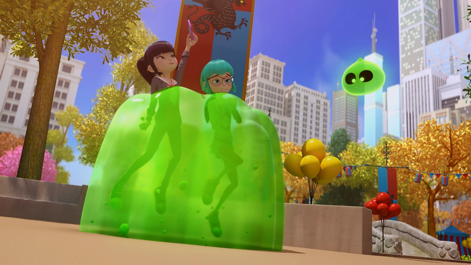 Because of his wild mental state, Jellyjack fought against the Ghostforce as they tried to stop his rampage at Times Square. Myst, in particular, tried to calm him down by feeding his more Scaryballs in the hope Jellyjack would return to Glups. However, it doesn't work since Myst caused his Boo Energy to quadruple and he grew much larger. Following a piece of advice from Miss Jones, Myst lured Jellyjack back to Central Park where he was trapped by Krush and Fury. He was then stunned by Glowboo's Solar Blast, allowing Myst to release Octocat to deboost him before trapping him in a Boo Cap.